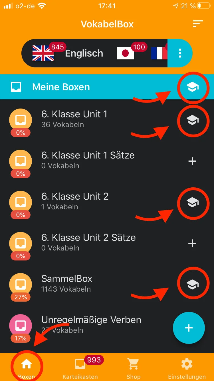 Hinweis: Durch einen Klick auf das Lernsymbol neben “Meine Boxen“ kannst du alle deine Vokabeln einer Sprache üben.