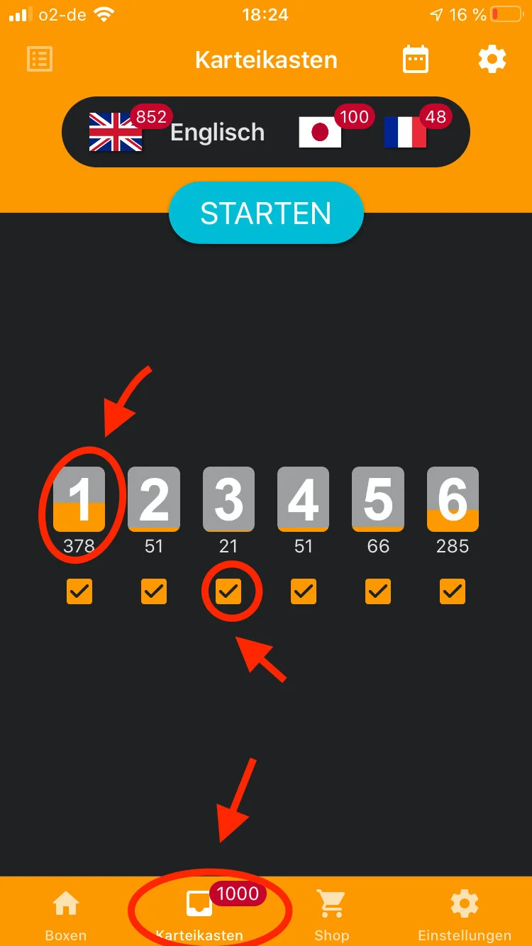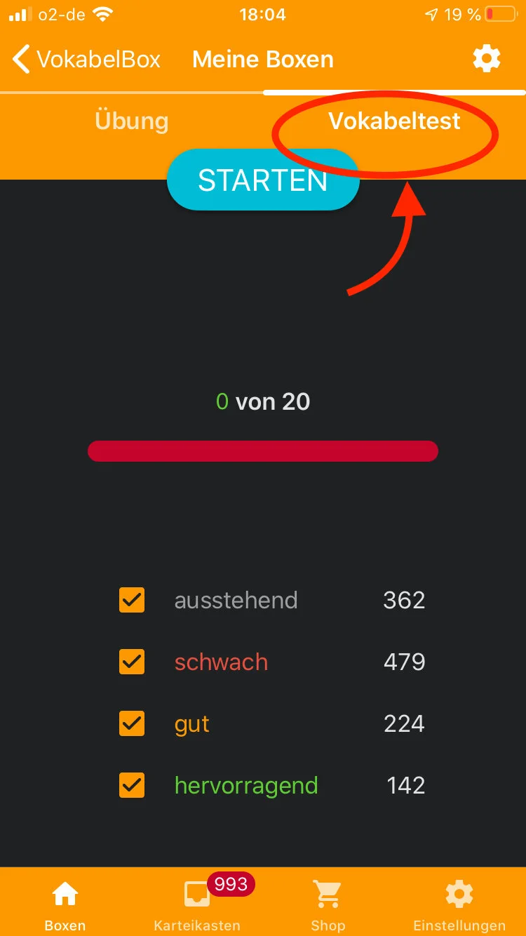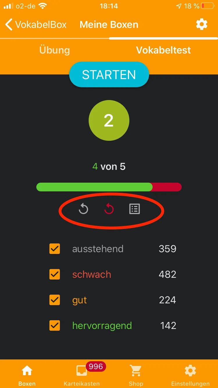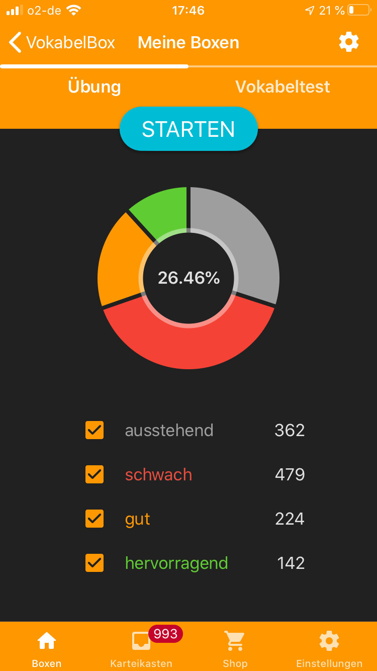 Klicke auf die Häkchen neben ausstehend, schwach, gut und hervorragend, um z.B. nur deine schwachen Vokabeln zu wiederholen.