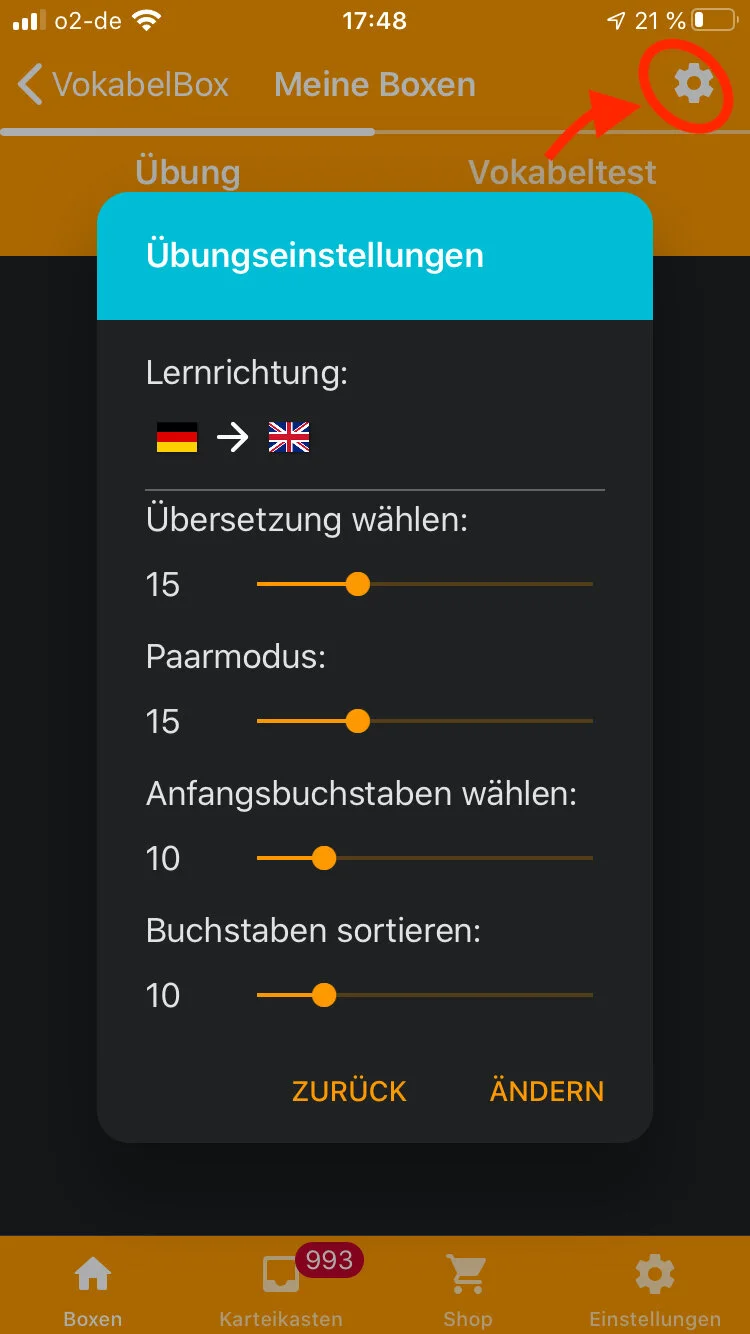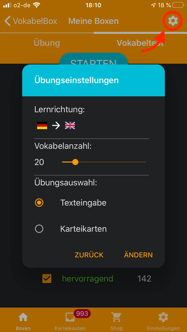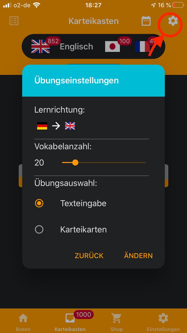 Durch einen Klick auf das Einstellungssymbol in der rechten oberen Ecke kannst du zwischen der Schreibübung (Texteingabe) und Karteikarten auswählen.