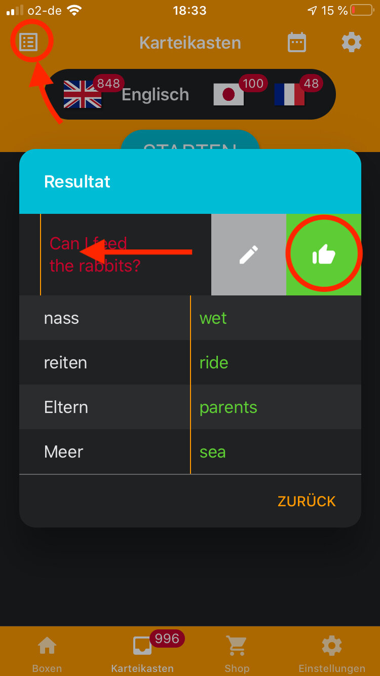 Um eine Vokabel nachträglich als richtig zu werten, musst du die Vokabel nach links wischen und auf den Daumen klicken.